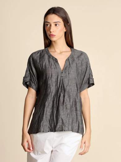 Blusa grigia in tessuto cangiante di misto lino, maniche corte con risvolto, linea ampia, scollo tondo con apertura a V sul davanti e bottoni, made in Italy, la modella indossa una tg.42, la modella ha le seguenti misure: altezza 177, seno 86,vita 65, fianchi 93