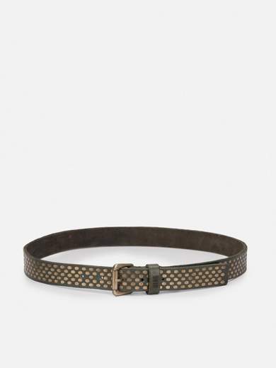 Cintura in pelle di vitello. Vite sul retro per tagliarla manualmente. Borchie dorate su tutta la cintura. Fibbia in oro antico.