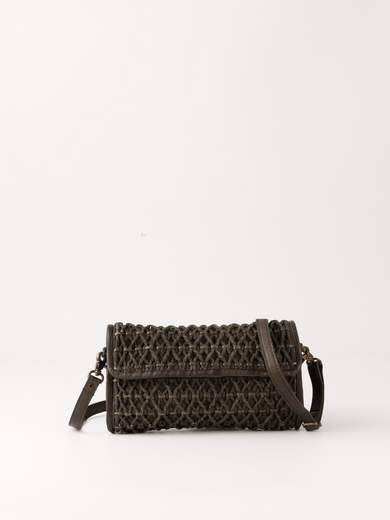 Borsa a tracolla fatta di pelle, arrotolata e intrecciata. Chiusura con aletta con due magneti e una chiusura interna.
