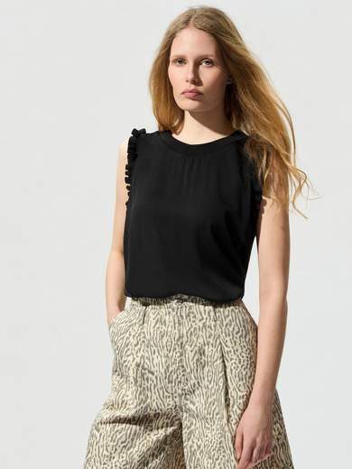Blusa senza maniche, con volant sulle maniche, scollo tondo, vestibilità regolare, tessuto morbido.