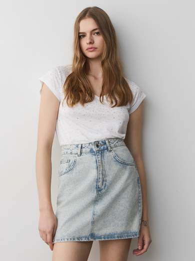 Minigonna di jeans, con strass, chiusura bottoni e chiusura con cerniera, con tasche, vestibilità normale.