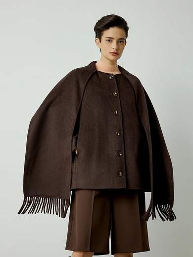 Cappotto corto, con maniche lunghe, chiusura con bottoni, con sciarpa, vestibilità ampia, consistenza morbida.