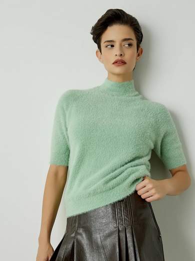 Maglione a maniche corte, con collo alto, con dettagli in lurex, vestibilità regolare, texture pelosa.