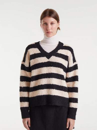 Maglione lavorato a maglia testurizzato nei toni del bianco e del nero. Presenta scollo a V e maniche lunghe con spalle leggermente scese.