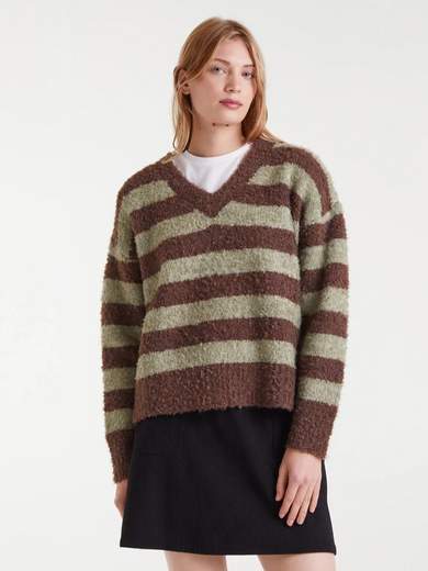 Maglione lavorato a maglia marrone e verde con scollo a V, maniche lunghe e spalle leggermente scese.