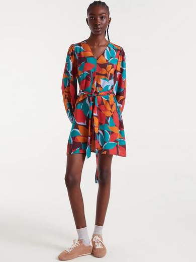 Abito corto in leggero tessuto crêpe con stampa Ponziana. Scollo a V e maniche a tre quarti con polsini elastici. Tasche laterali e dettaglio con laccetto in vita.