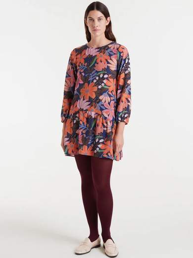 Abito corto in leggero tessuto crêpe con stampa Tigerlily. Scollo a barca e maniche lunghe alla francese con polsini elastici. Tasche laterali.