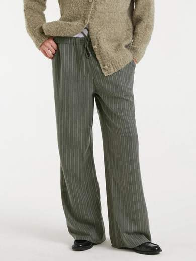 Pantaloni gessati grigio-verdi. Vita media con elastico posteriore in vita. Gamba dritta con chiusura a coulisse.