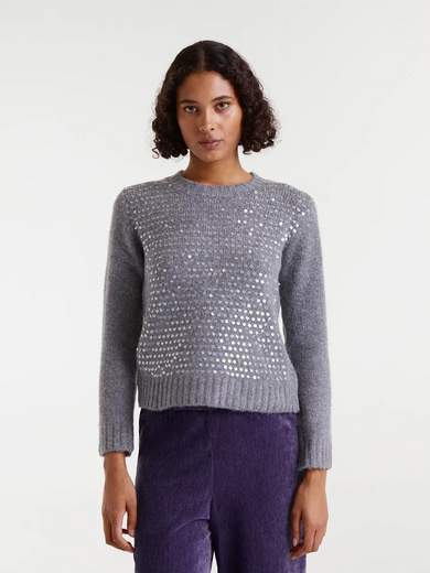 Maglione grigio in maglia con dettagli in paillettes. Scollo rotondo e maniche lunghe.