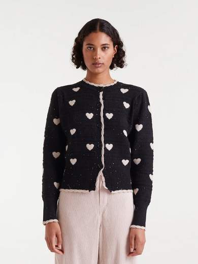 Cardigan jacquard con stampa White Hearts. Scollo rotondo e maniche lunghe a sbuffo. Chiusura frontale con bottoni. Dettagli a coste.