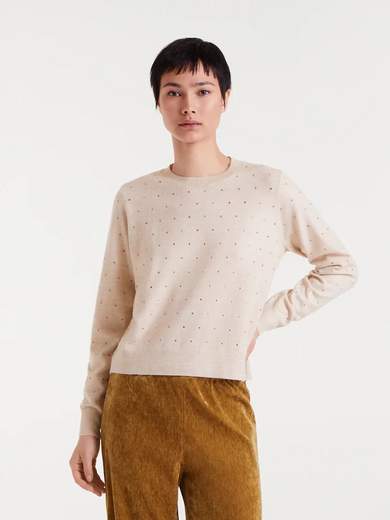 Maglione beige a maglia fine con scollo rotondo e maniche lunghe. Applicazioni glitterate multicolori. Finiture a coste.