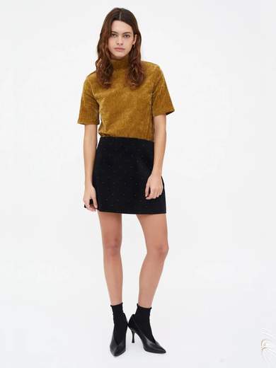 Gonna corta in velluto nero. Vita alta. Chiusura con cerniera laterale invisibile. Modello con applicazioni argentate.