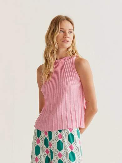 Top seza maniche, con scollo a barchetta, plissettato dal collo fino al fondo