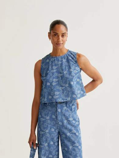 Top con stampa paisley. Scollo rotondo e senza maniche. Chiusura con bottoni nascosti sul retro dello scollo a V. La modella è alta 173 cm e indossa una taglia S.
