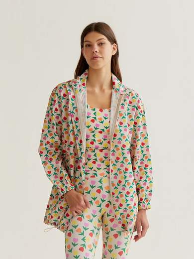 Giacca con stampa di tulipani multicolor. Scollo rotondo e maniche lunghe con polsini elasticizzati. Chiusura frontale con zip. Spalle leggermente scese. Cappuccio regolabile. La modella è alta 177 cm e indossa la taglia S.