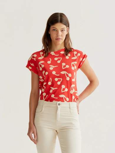 T-shirt con stampa a rete bordeaux. Scollo rotondo e maniche corte. La modella è alta 177 cm e indossa una taglia S.