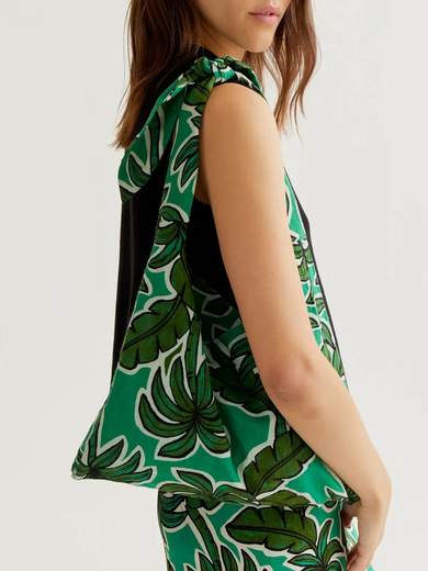 Borsa in tessuto 100% cotone con stampa di palme. Manico corto con laccetto. Interno foderato.