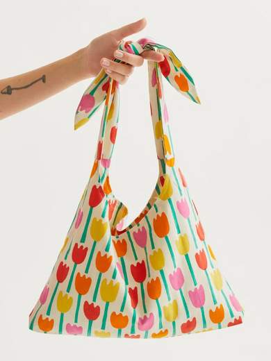 Borsa in tessuto 100% cotone con stampa a tulipani. Manico corto con laccetto. Interno foderato.