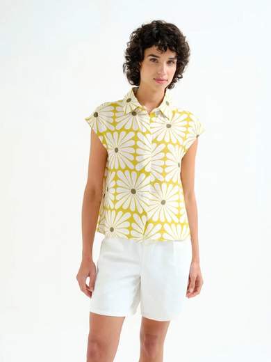 Camicia in crêpe con stampa a fiori color oliva. Collo a revers e senza maniche. Chiusura frontale con bottoni nascosti. La modella è alta 175 cm e indossa una taglia S.