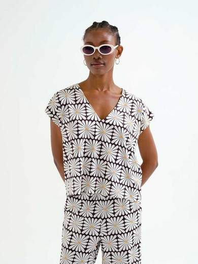 Top morbido fantasia, con manica corta e scollo a V