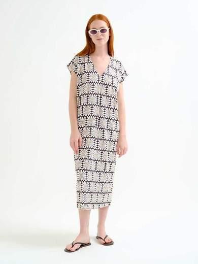 Kaftano lungo e largo in jersey fantasia, con manica corta e scollo a V