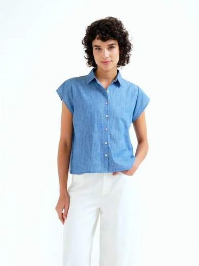 Camicia realizzata in chambray di cotone 100% di colore azzurro. Presenta collo a revers, maniche corte e chiusura frontale con bottoni bianchi a forma di fiore. La modella è alta 175 cm e indossa una taglia S.