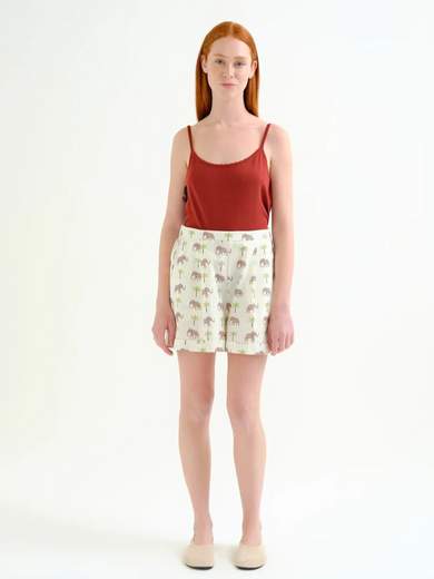 Shorts in 100% cotone con stampa elefante. Vita alta con elastico e gamba dritta. Tasche laterali. La modella è alta 175 cm e indossa una taglia S.