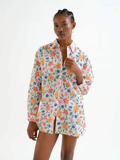Camicia lunga e larga in cotone fantasia, manica lunga e colletto