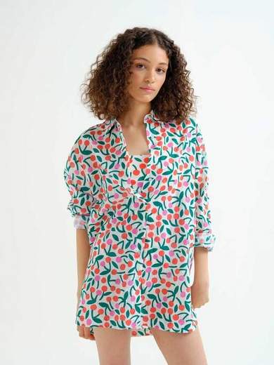 Camicia larga e lunga in cotone fantasia, con manica lunga e colletto.