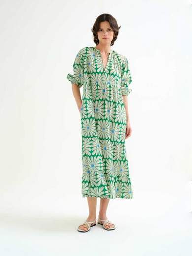 Abito largo e lungo fantasia, manica a tre quarti, taglio in vita, giro collo con V, balza in fondo