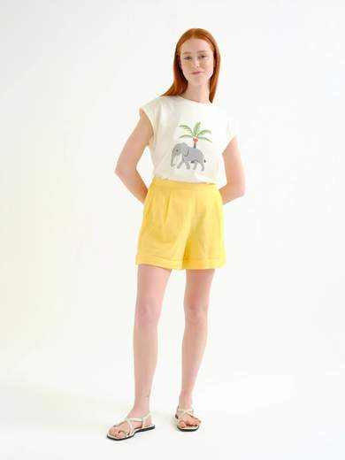 Pantaloncini gialli in 100% cotone. Vita alta con elastico in vita. Gamba dritta. Foderati. La modella è alta 175 cm e indossa una taglia S.