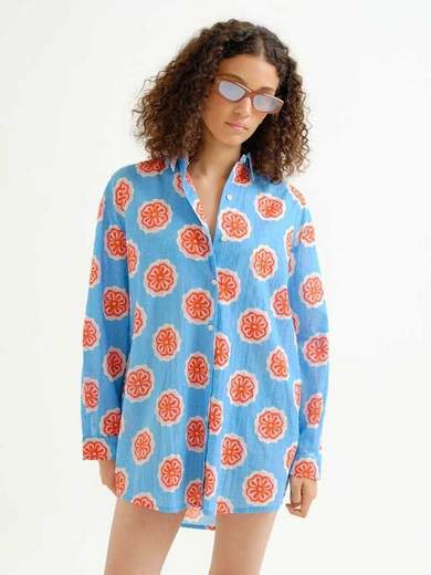 Camicia larga e lunga in cotone fantasia, con manica lunga e colletto