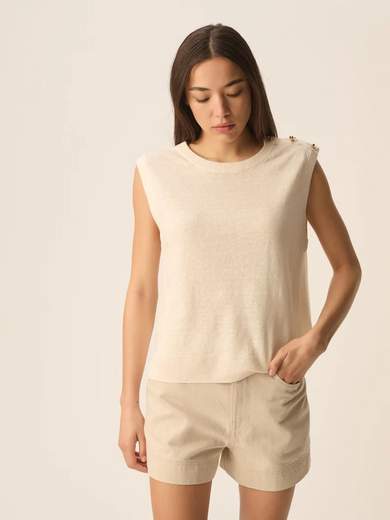 Il top a maglia senza maniche di Brazou passerà all'estate, realizzato con un lino francese leggero e confortevole. Decorato con bottoni dorati a forma di fiore sulle spalle, questo top chic e senza sforzo metterà in evidenza tutte le tue silhouette.