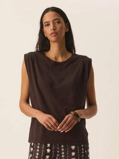Un classico dell'abbigliamento primaverile-estate, la canottiera Zaeba in cotone crea un aspetto casual e urbano. Modernizzato da un taglio ampio femminilizzato con pieghe sulle spalle, un top senza maniche comodo e versatile da indossare infilato in jeans a vita alta o in una gonna.