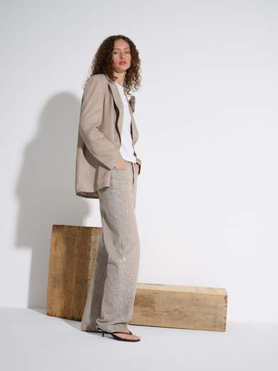 Giacca a un bottone, con tasche a pattina, con applicazione di un fiore in tessuto.