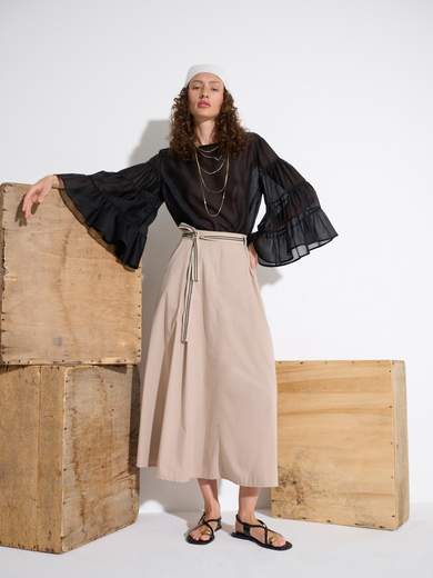 Gonna lunga svasata con piegoni sul davanti, con tasche e cinta in nastro bicolore.