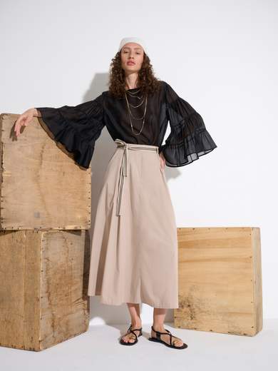 Blusa morbida e liscia davanti, con maniche lunghe e molto larghe, con tagli  orizzontali sulle maniche a creare delle balze