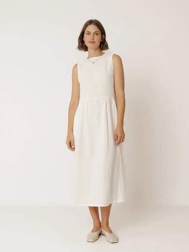 Un vestito con scollo a V o a collo rotondo. È fatto al 100% di lino, che da quel tocco rustico.