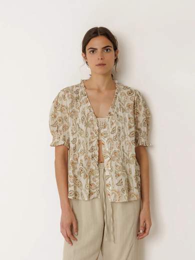 Maglia voile in cotone stampata biologico con maniche corte e finitura elastica. Scollo a V profondo e micro-volant con chiusura frontale e vita arricciata. Un pezzo speciale per la stagione.