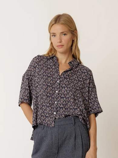 Camicia oversize in viscosa sostenibile, con un motivo a stampa a blocchi.