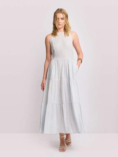 Abito lungo dal design smanicato con scollo all'americana e corpino strutturato.