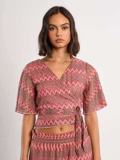 Scollo a V, incrociato e cintura da annodare in vita. Modello corto e aderente.