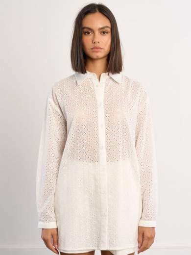 Camicia a maniche lunghe, polsini abbottonati. Chiusura frontale lunga a bottoni.