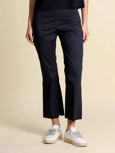 Pantaloni in popeline di misto cotone stretch, vita elastica, linea a trombetta.
