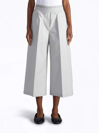 Pantaloni crop in popeline leggero, con fascione alto elastico in vita. Gamba larga, sopra la caviglia.