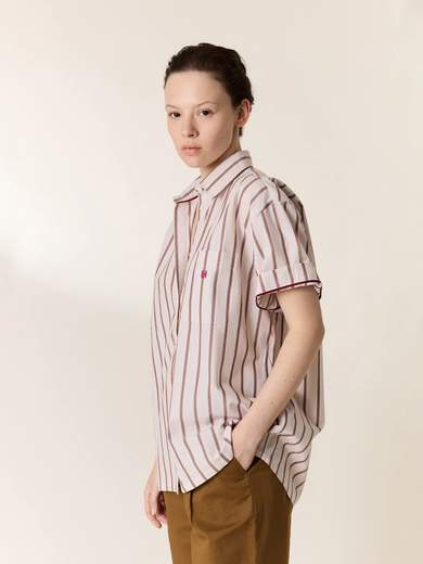 Ispirata all'abbigliamento maschile, la maglietta Clay presenta una stampa a righe audaci. Questo pezzo senza tempo rivisita i codici di uniformità per creare una silhouette che è sia casual che raffinata.