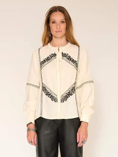 Realizzata in 100% cotone , questa blusa leggera e testurizzata garantisce comfort per tutto il giorno. Il suo design esclusivo include un delicato ricamo nero sul davanti, che aggiunge un tocco di raffinatezza con motivi floreali simmetrici, creando un accattivante effetto visivo.