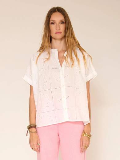 Una camicetta bianca chiara, lavorata in un gioco di ricamo, con un  taglio è fluido, leggermente largo, con maniche corte, ideale per le giornate di sole.  Può essere indossato con il denim o con pantaloni colorati per un look estivo morbido, fresco e naturalmente elegante.
