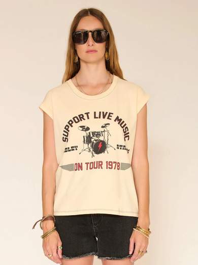 T-shirt a girocollo dall'aspetto decisamente rock, Tamus è disponibile in diversi colori. Il suo messaggio "Support Live Music", accompagnato da una batteria stampata, afferma un'estetica grezza e musicale. Un pezzo forte, grafico, pensato per infondere un'energia rock a una figura semplice.