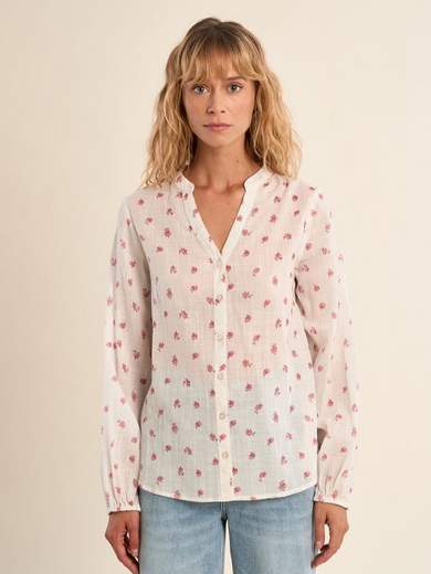 Camicetta di cotone, con motivo floreale, scollo a V e maniche lunghe.
